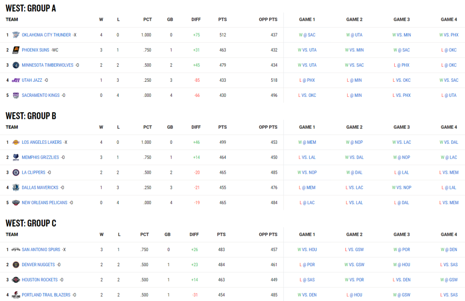 西部这边雷霆、湖人、马刺都是以小组第一身份晋级八强,只有太阳队是以小组第二战绩最好(净胜分最多)晋级八强,湖人、雷霆都是四连胜但因为雷霆净胜分+75更高所以雷霆是一号种子。