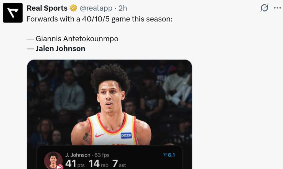 这样的表现也让杰伦约翰逊成为新赛季至今第二位单场拿下至少40分10篮板5助攻的前锋,另外一人是字母哥,他已经两次交出这样的表现。