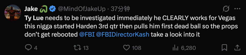 网友Jake:Ty Lue needs to be investigated immediately he CLEARLY works for Vegas this nigga started Harden 3rd qtr then pulls him first dead ball so the props don’t get rebooted take a look into it