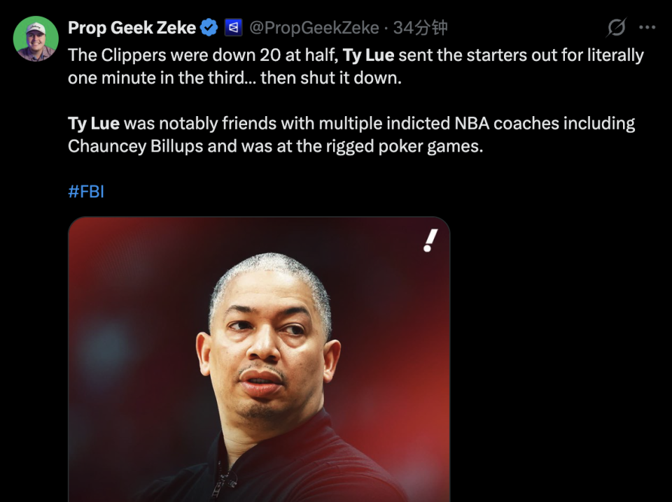 财经博主Prop Geek Zeke:The Clippers were down 20 at half, Ty Lue sent the starters out for literally one minute in the third… then shut it down. Ty Lue was notably friends with multiple indicted NBA coaches including Chauncey Billups and was at the rigged poker games.