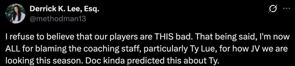 球迷Derrick K Lee:I refuse to believe that our players are THIS bad. That being said, I'm now ALL for blaming the coaching staff, particularly Ty Lue, for how JV we are looking this season. Doc kinda predicted this about Ty.