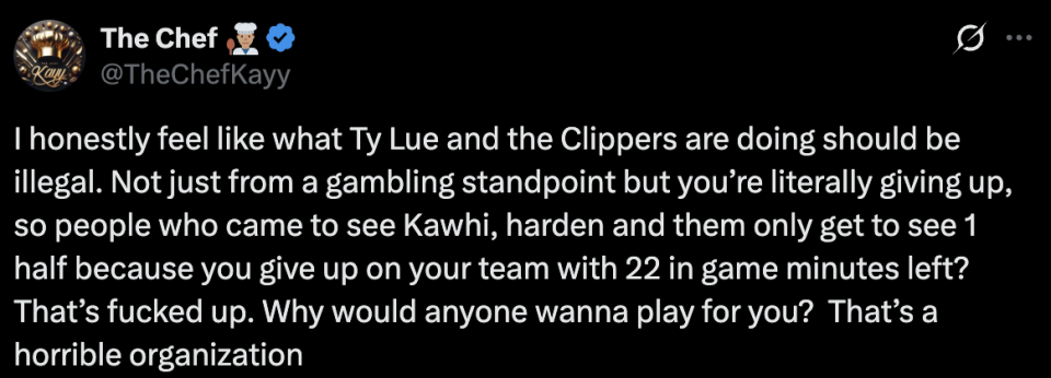 评论员The Chef:I honestly feel like what Ty Lue and the Clippers are doing should be illegal. Not just from a gambling standpoint but you’re literally giving up, so people who came to see Kawhi, harden and them only get to see 1 half because you give up on your team with 22 in game minutes left? That’s fucked up. Why would anyone wanna play for you? That’s a horrible organization