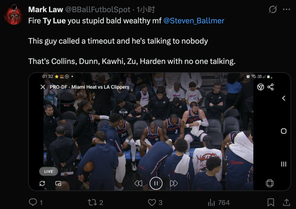 球迷Mark Law:Fire Ty Lue you stupid bald wealthy mf This guy called a timeout and he's talking to nobody That's Collins, Dunn, Kawhi, Zu, Harden with no one talking.
