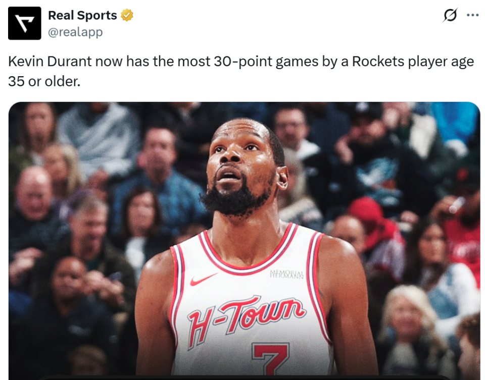 凭借这样的表现,杜兰特35岁之后代表火箭队6次砍下30+得分表现,超越奥拉朱旺独占火箭队史第一。