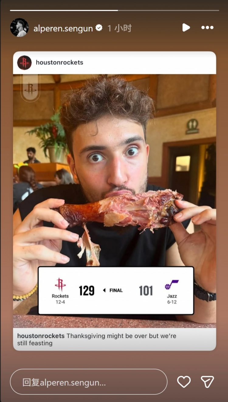 赛后火箭队晒出申京吃火鸡的图片嘲讽爵士:“感恩节已经结束,但我们还在吃大餐!”申京本人还进行了转发。