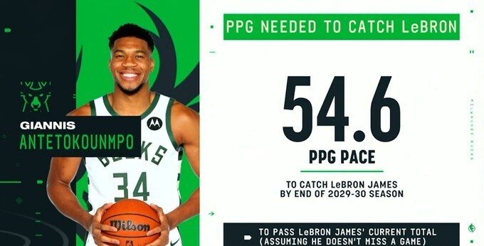“仅”需场均54.6分,字母哥就能在2030年追上詹姆斯现在总得分