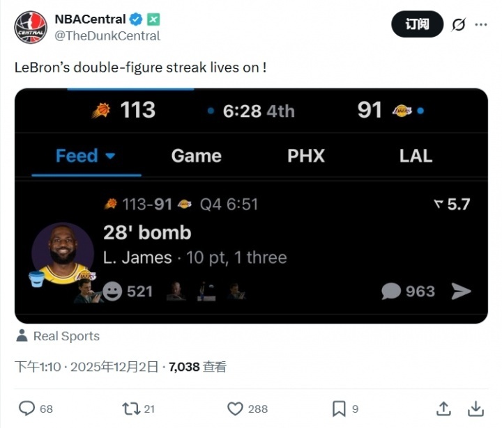 美媒NBACentral更是“讽刺”庆祝:詹姆斯的得分上双纪录保住了!
