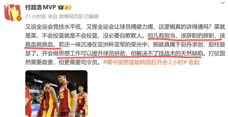 两战韩国失利后,众多媒体人也怒了,但很少有人公开喊出郭士强下课。不过付政浩成为第一个喊出郭士强下课的媒体人,他在社媒说,“但凡有担当,该辞职的辞职,该换血就换血。”付政浩说的“该辞职的辞职”或许指的就是郭士强,而“该换血就换血”则指的是队员。