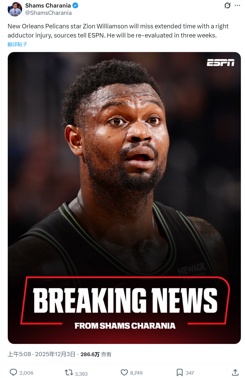 北京时间12月3日,据NBA名记Shams报道,鹈鹕球员锡安遭遇右内收肌拉伤,将在3周后接受复查。没错,锡安又双叒伤了。本赛季常规赛只打了21场左右,锡安已经遭遇三种伤病:左脚骨挫伤、左腿筋一级拉伤、右内收肌拉伤。