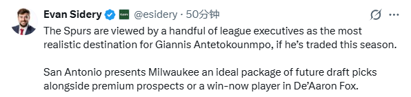 字母哥可能申请离队引热议,美记Evan Sidery后续报道称,几位联盟高管认为,如果字母哥在本赛季被交易,马刺被视为他最有可能的下家;马刺可以为雄鹿提供理想的未来选秀权组合,同时还能提供顶级新秀或即战力球员福克斯。