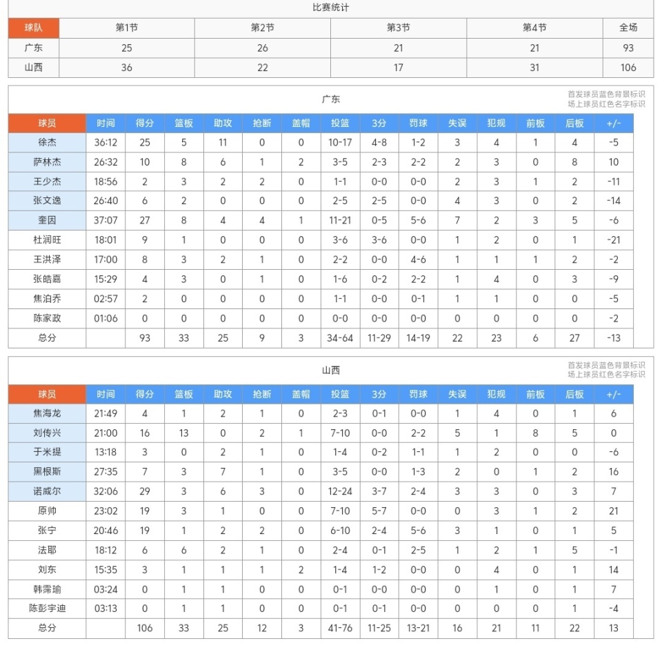 第三节广东队一度反超比分,徐杰大爆发,他和奎因打出了后场双枪的效果,只不过之后山西又拿回了优势,三节战罢,广东72-75落后!末节山西队重新将优势拉开,广东只有徐杰和奎因两人比较靠谱,最后还是没能改变局面,遗憾输掉了比赛!