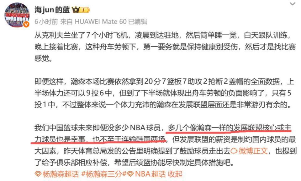 对此媒体人海jun的蓝也发文谈到了杨瀚森的情况,他表示:“我们中国篮球未来即便没多少NBA球员,多几个像瀚森一样的发展联盟核心或主力球员也是幸事,也不至于连输韩国两场。但发展联盟的薪资是制约国内球员的最大因素,昨天体育总局发的公告里明确提到了鼓励球员走出去,也提到了给予俱乐部相应补偿,希望后续篮协能尽快制定具体措施吧。”
