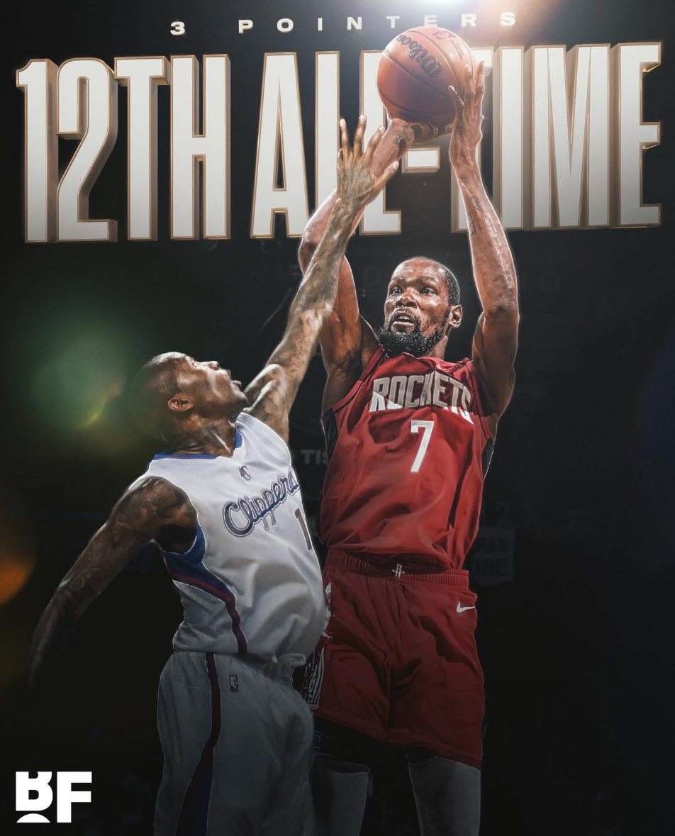 杜兰特第二个里程碑,三分球命中数超越贾马尔-克劳福德升至历史第 12 位。