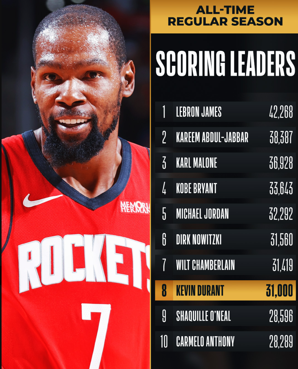 杜兰特此役完成了31000分里程碑,他成为历史第八位完成31000分+的球员。杜兰特拿到31000分用1141场,追平詹姆斯并列历史第三快。