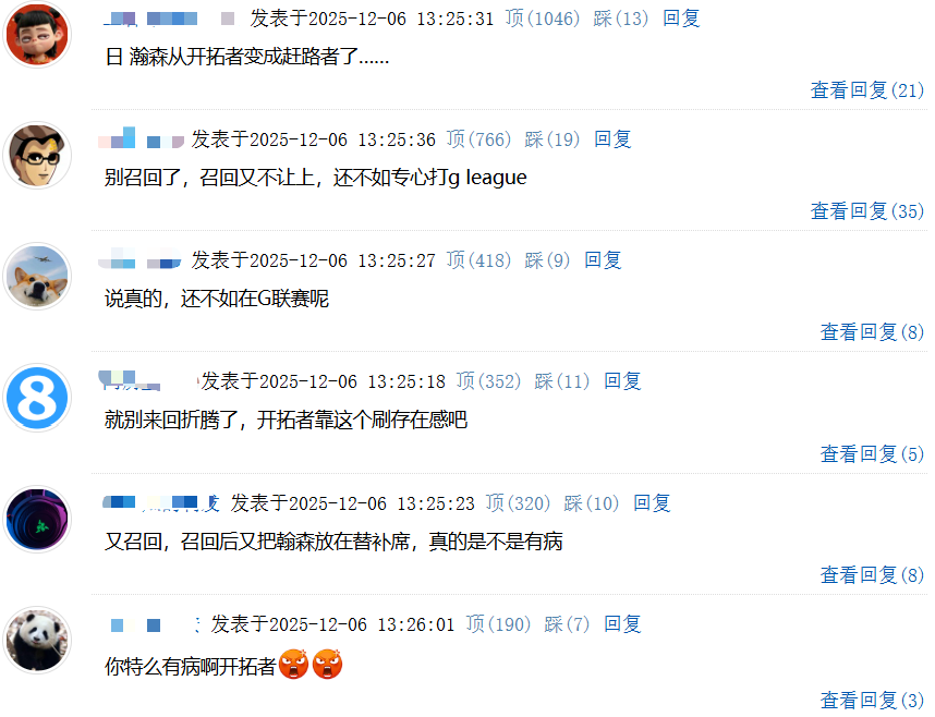 网友们对开拓者频繁下放又召回杨瀚森的行为很是不满,如下: