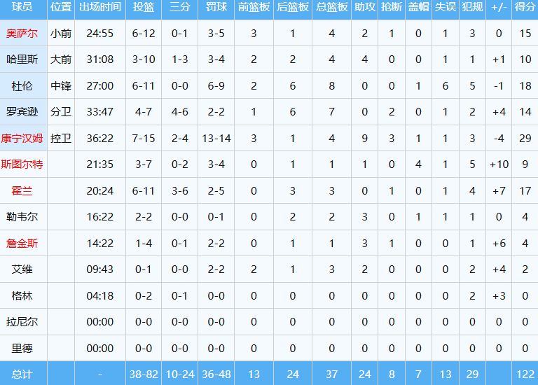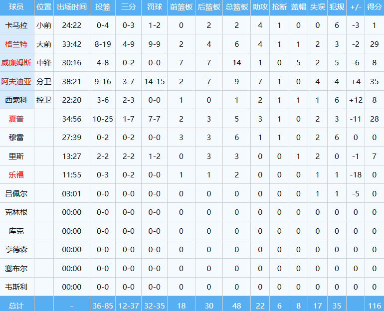 本场比赛克林根因小腿伤势缺阵,罗威出任首发中锋贡献8分14板(7前场板)5帽,里斯则担任替补中锋得到7分3板。