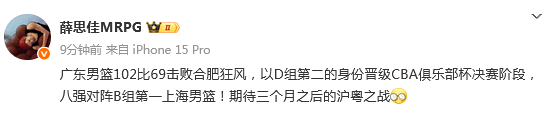 根据赛制的规则,广东男篮102比69击败合肥狂风,以D组第二的身份晋级CBA俱乐部杯决赛阶段,八强对阵B组第一上海男篮!期待三个月之后的沪粤之战。