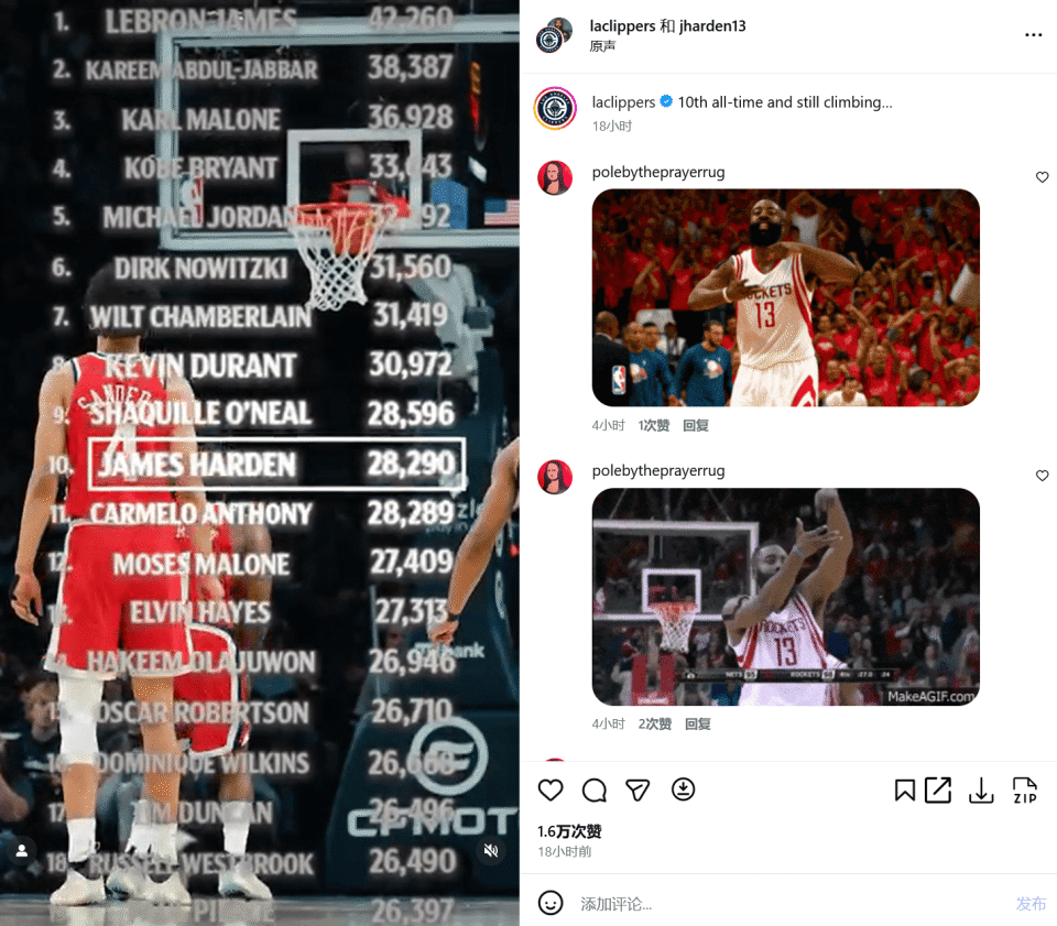 在今天早些时候,哈登更新社交媒体庆祝自己的成就,并写道:“总得分历史第10,而且仍在攀登!”