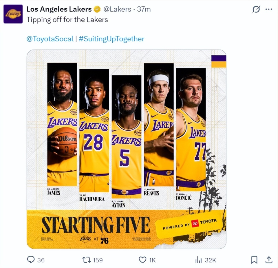 湖人:东契奇、里夫斯、詹姆斯、八村垒、艾顿;