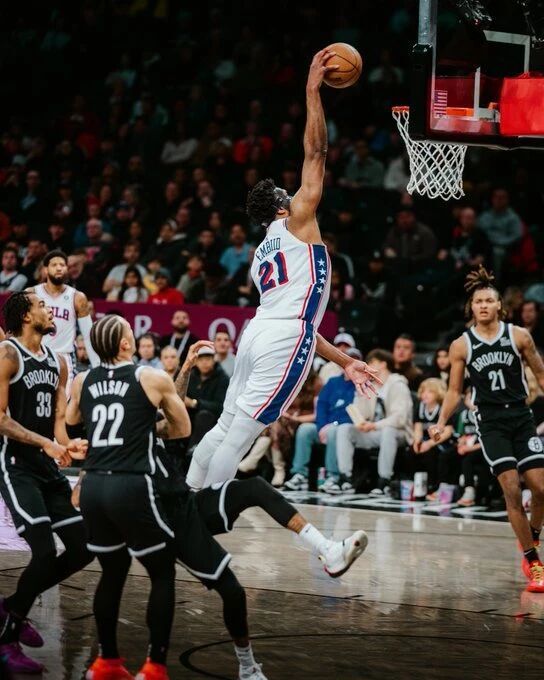 当恩比德背打里夫斯却选择转身中投的时候,我的脑海里恩比德的职业生涯种种画面如同走马灯一般闪过,他在费城主场聆听观众山呼海啸的欢呼,他在球员通道痛哭流涕,他举起第一座MVP的奖杯,最后的一幕是他倒地被库明加坐在了膝盖上。