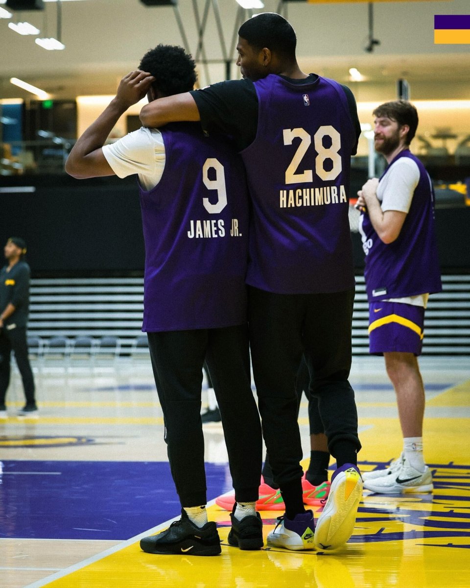 即将41岁的詹姆斯戴着一顶紫色的针织帽,身穿6号训练服,满脸笑容十分开心;东契奇则是戴着发带参加训练,与里夫斯同框出镜,脸上同样写满了开心;八村垒搂着布朗尼,站在场边悠闲聊天。