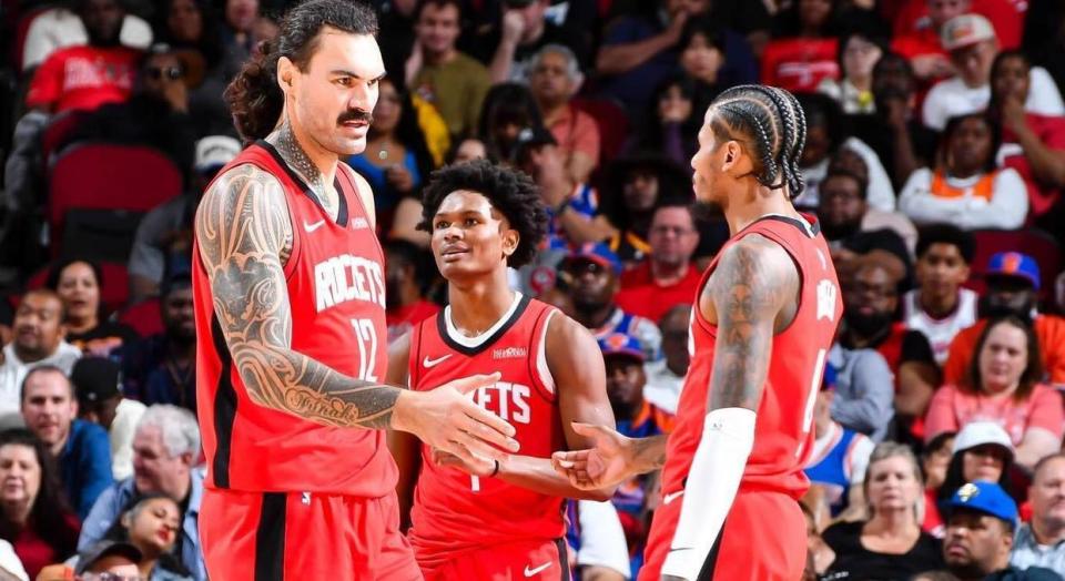 而32岁的老将中锋亚当斯,则是火箭队的前场篮板王,甚至他的前场篮板率在联盟当中都高居第一。32岁的亚当斯虽然不是什么超级中锋,然而他是联盟当中最强壮的内线球员之一。他和申京在一起搭档可以优势互补:亚当斯能护框、能抢篮板,尤其是前场篮板,能够为申京协防和补防;而申京则可以为亚当斯拉开内线空间,他也可以在内线得分,帮助火箭队缓解亚当斯进攻能力不足的压力。