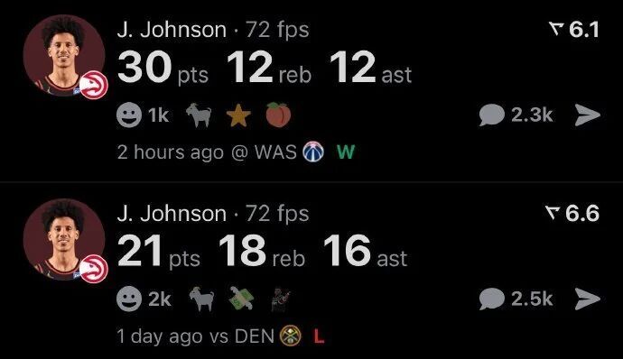年仅23岁的约翰逊,已成长为新鹰王,本赛季至今场均出战35.2分钟,砍下23.4分10.5板7.9助1.6断,投篮命中率53.4%,场均以40.4%命中率扔进1.6记三分球,带领老鹰以14胜11负排名东部第九,可谓是前途无量。