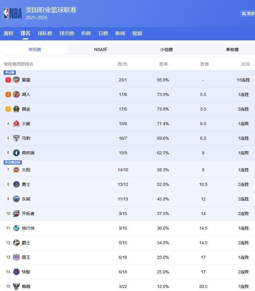 NBA25-26赛季常规赛正在如火如荼的进行,本赛季的西部,形势发生了不小的变化!雷霆独霸榜首,湖人、掘金、火箭、马刺难分上下,4队差距仅1场,抢夺西部第2;森林狼、太阳是进入季后赛的中坚力量,勇士第8则难保,灰熊一直在抢夺;快船则是越输越输,球队想进入附加赛都悬了,这也导致西部排名大变脸:差距仅1场,4队抢2;灰熊直追勇士,快船附加赛悬了!
