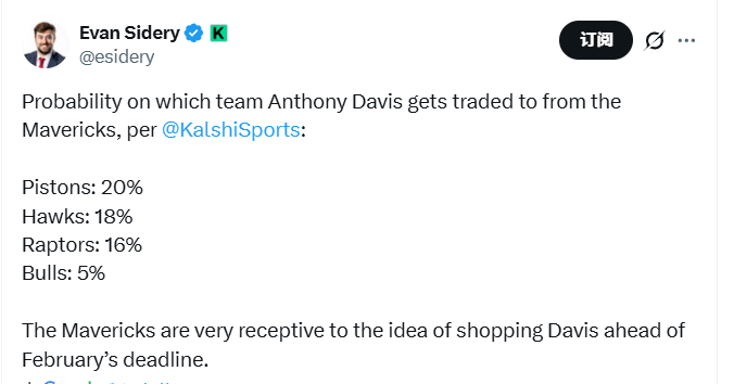 北京时间12月11日,据名记Sidery报道,独行侠非常乐意在明年2月交易截止日前兜售浓眉。Kalshi Sports给出的赔率预测,浓眉被独行侠交易至各队的概率如下——