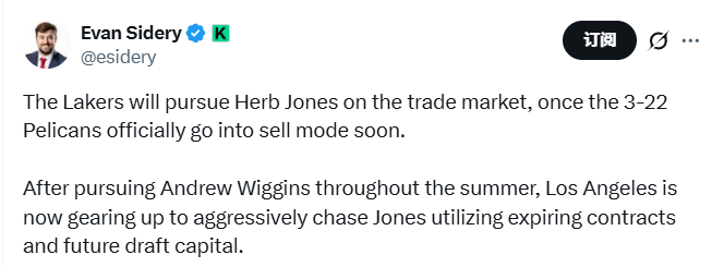 北京时间12月11日,据NBA名记Sidery报道,一旦目前战绩仅为3胜22负的鹈鹕队正式开启甩卖模式,湖人便会在交易市场上追求赫伯特-琼斯。经过休赛期对维金斯的持续追逐后,湖人如今正筹备利用到期合同和未来选秀权,全力出击追逐琼斯。