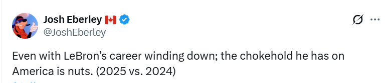 詹姆斯的人气继续断层优势霸榜,NBA记者Josh Eberley晒出了今年和去年的对比图,感慨道:“即使勒布朗的职业生涯已接近尾声,但他在美国的影响力依然惊人。(2025年对比2024年)”