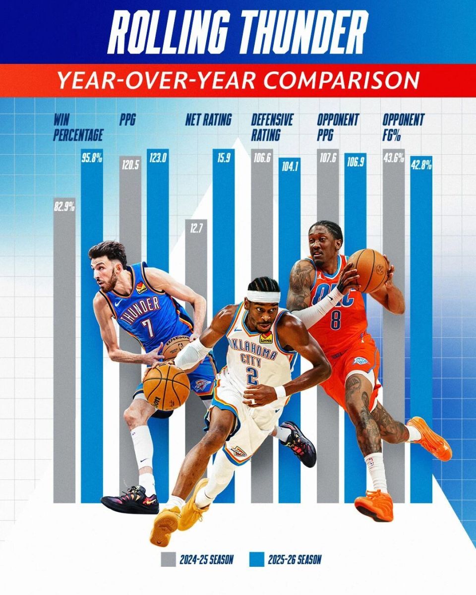 当布克确定不打时,这场已经没什么悬念了。太阳14胜10负,排名西部第七。这个战绩超出大家的预期,上赛季太阳连附加赛都没进。雷霆豪取15连胜,目前23胜1负排名联盟第一。跟上赛季相比,本赛季雷霆多项数据更进一步: