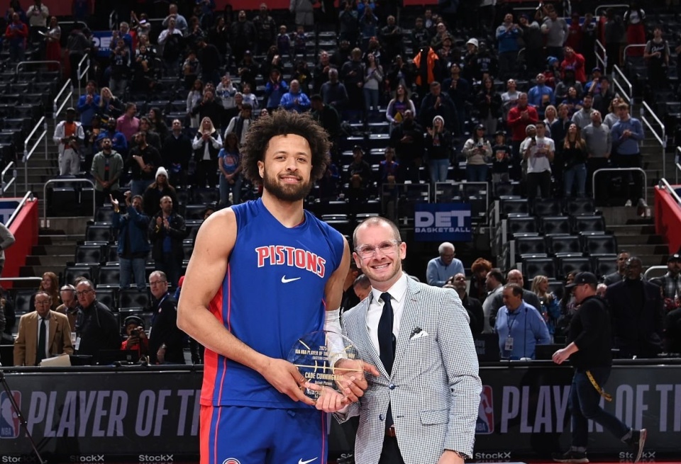 坎宁安毫无悬念获得了11月东部最佳球员奖项。他本赛季目前场均得到26.9分6.1篮板9.1助攻1.5抢断,投篮命中率45.4%,三分命中率30.7%,罚球命中率82.8%。坎宁安在本赛季助攻榜上排名第二。他的场均得分和抢断都创造了生涯新高。当坎宁安在场时,活塞队的净效率值为+8.5,而当他不在场时,球队的净效率值则为-0.6。