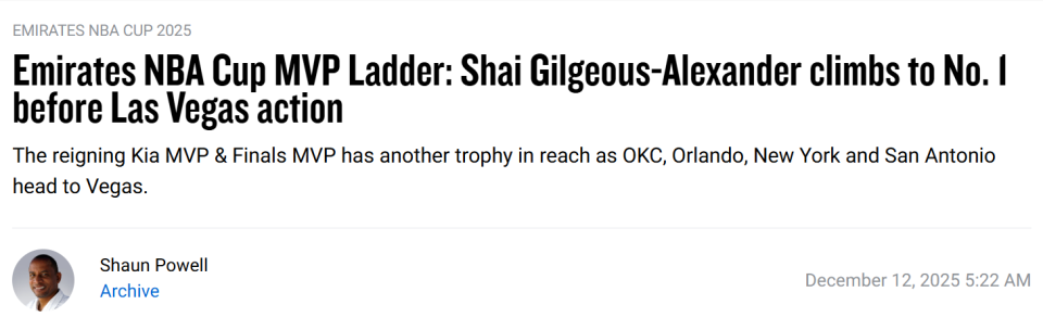 NBA杯MVP排名更新:亚历山大升至第一 尼克斯双星杀入前五