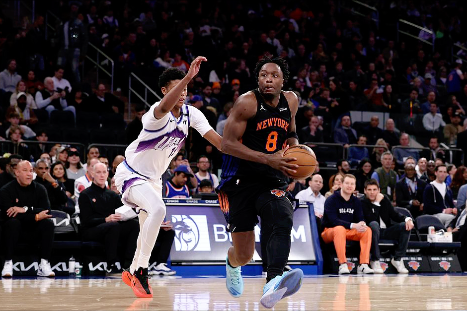 然后是布里奇斯,他场均能拿16.4分,投篮命中率高达52.5%。他很会利用布伦森和唐斯创造的空间,通过空切和定点投篮惩罚对手。防守端,布里奇斯场均贡献两次抢断以及一次盖帽,凭借惊人的臂展截断传球路线,场均4.3次助攻更是其职业生涯的新高,相较于上赛季的3.7次助攻,组织能力有了明显进步。