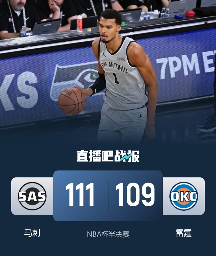 NBA杯半决赛今日打响,西部领头羊雷霆迎战西部第五的马刺。雷霆此前49分狂胜太阳顺利晋级,马刺则击败湖人杀入半决赛,文班亚马本场迎来复出。