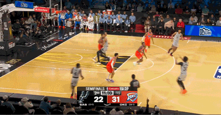 面对联盟第一强队,马刺开局太紧张了,首节前12次三分出手全部打铁。第一节快要打完时,卡斯尔和凯尔登才在外线命中,马刺第一节三分球只有14中2。雷霆外线也不准,单节三分10中3。第一节打完,雷霆31-20领先马刺11分。