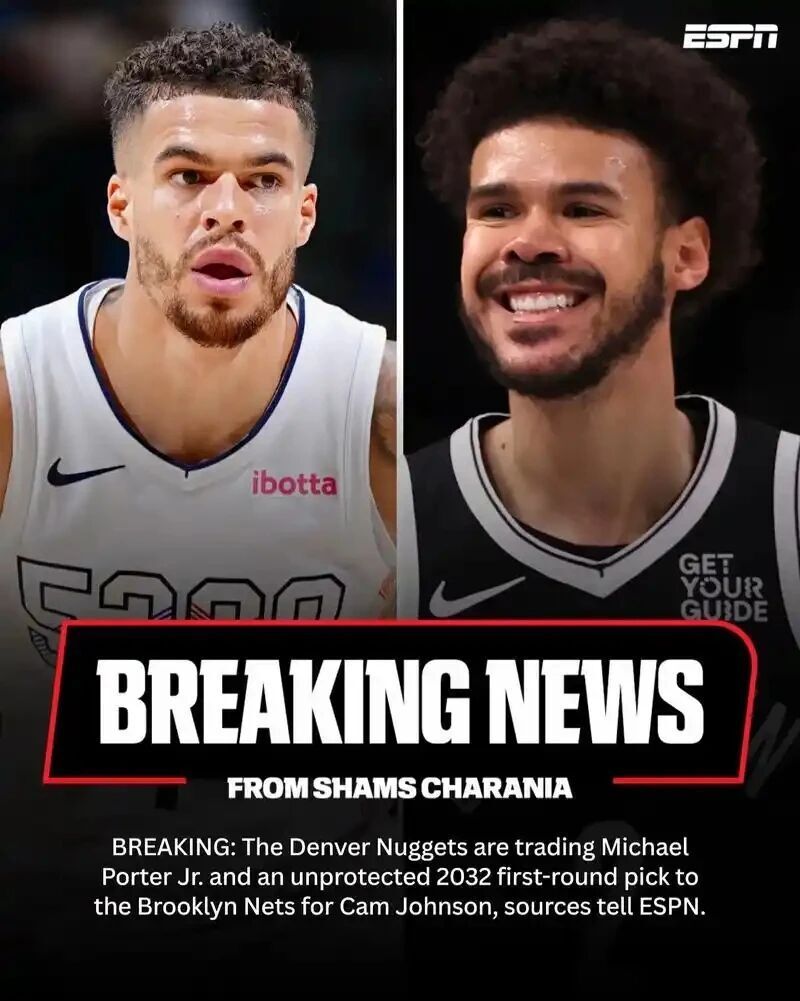 今夏休赛期,掘金放弃了合作七个赛季之久(23年夺冠)的小波特,将他和一个32年无保护首轮签交易至篮网,只为换来卡梅伦-约翰逊。掘金目前以18胜6负高居西部第二,约翰逊在此期间场均11.3分3.4板2.2助进账。