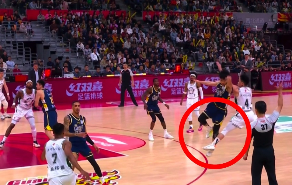 南京队球员邬挺嘉在外线尝试投射三分球,他在起跳投篮的过程中,双腿做出了一个幅度极大的劈叉动作。这个非自然的身体舒展直接扩大了他的圆柱体范围,而在他落地的前一刻,张开的腿部直接勾到了正在贴防的徐杰。这是一个非常危险的接触动作,在高速对抗中,防守球员往往很难预判进攻方这种超出常规的肢体延伸。徐杰在毫无防备的情况下失去重心,重重地摔向地板。现场转播镜头清晰地记录下了这惊魂一刻,徐杰倒地时头部似乎重重磕到了坚硬的地板上,随即便出现了流血的情况。当值的裁判员在回看录像后,并没有对这次进攻犯规升级,虽然规则上对于此类动作有明确界定,但该动作对防守球员造成的实际伤害后果,判罚违体犯规或许更为合理。