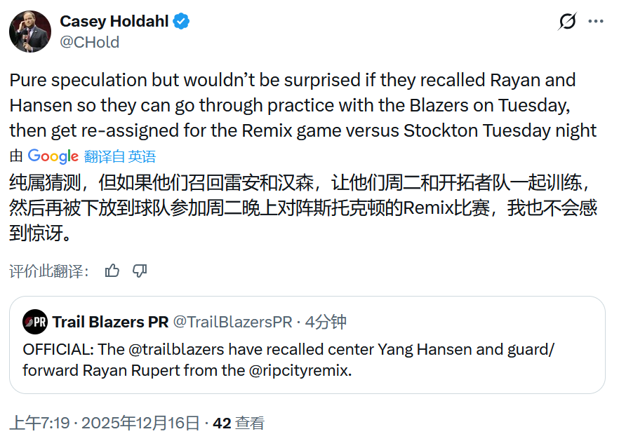 在本场比赛结束之后,开拓者队官宣召回杨瀚森和吕佩尔。需要说明的是,开拓者队近日并没有比赛,而混音队明天则还要继续和国王队交手。对此,队记Casey Holdahl表示:“纯属猜测,开拓者队召回杨瀚森和吕佩尔,让他们和球队一起训练。但是如果他们明天再被下放去打混音队与国王队的比赛,我也不会感到惊讶!”