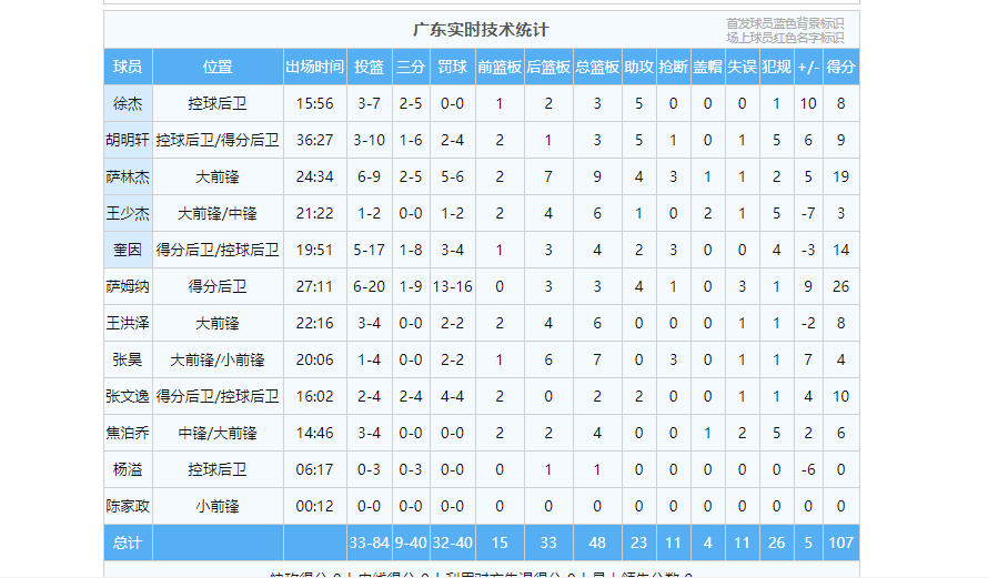 广东男篮首轮击败同曦男篮得到107分