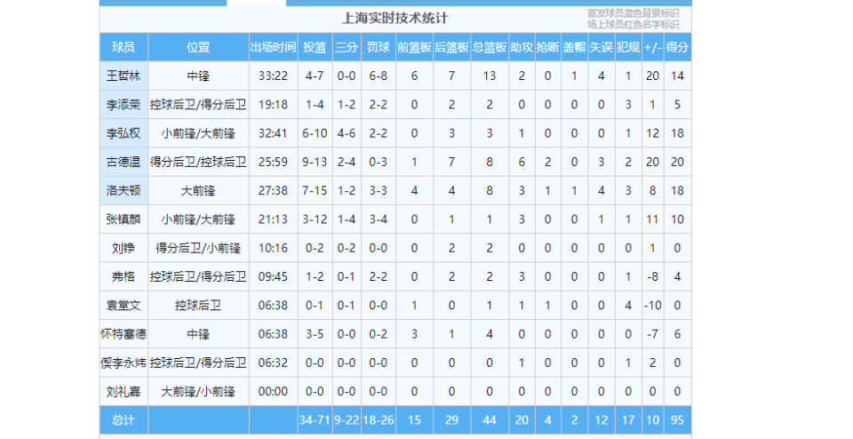 上海男篮首轮击败吉林男篮得到95分