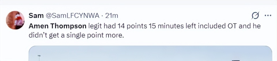 火箭记者在比赛最后15分钟之前阿门就拿到14分,随后阿门-汤普森是一分都没有拿。
