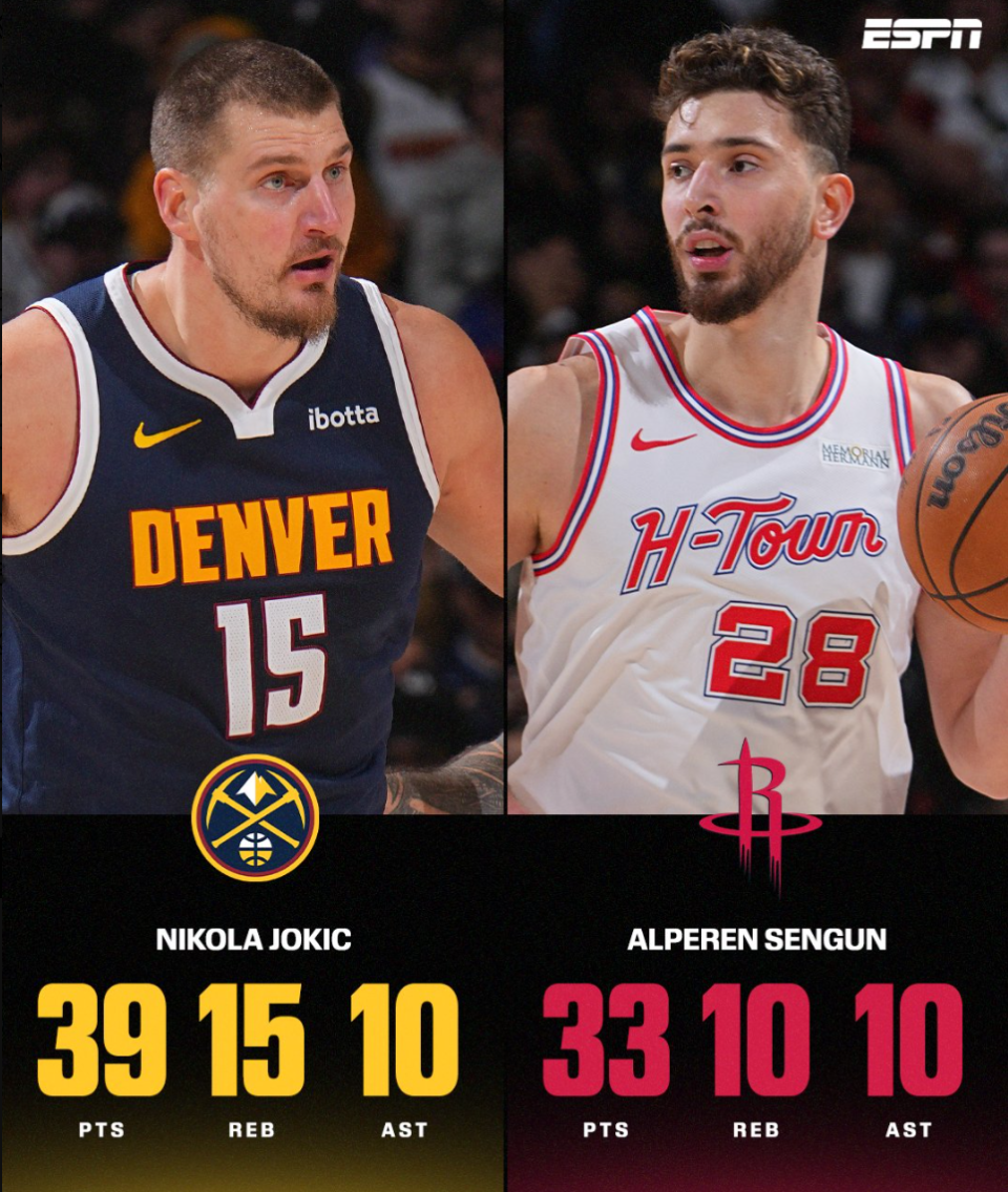 火箭3分惜败掘金,约基奇鏖战43分钟拿到39分15篮板10助攻2抢断2盖帽,申京鏖战42分钟拿到33分10篮板10助攻2抢断1盖帽,两位联盟最顶级的中锋都拿到30+三双的数据,但赛后却没有人讨论数据。