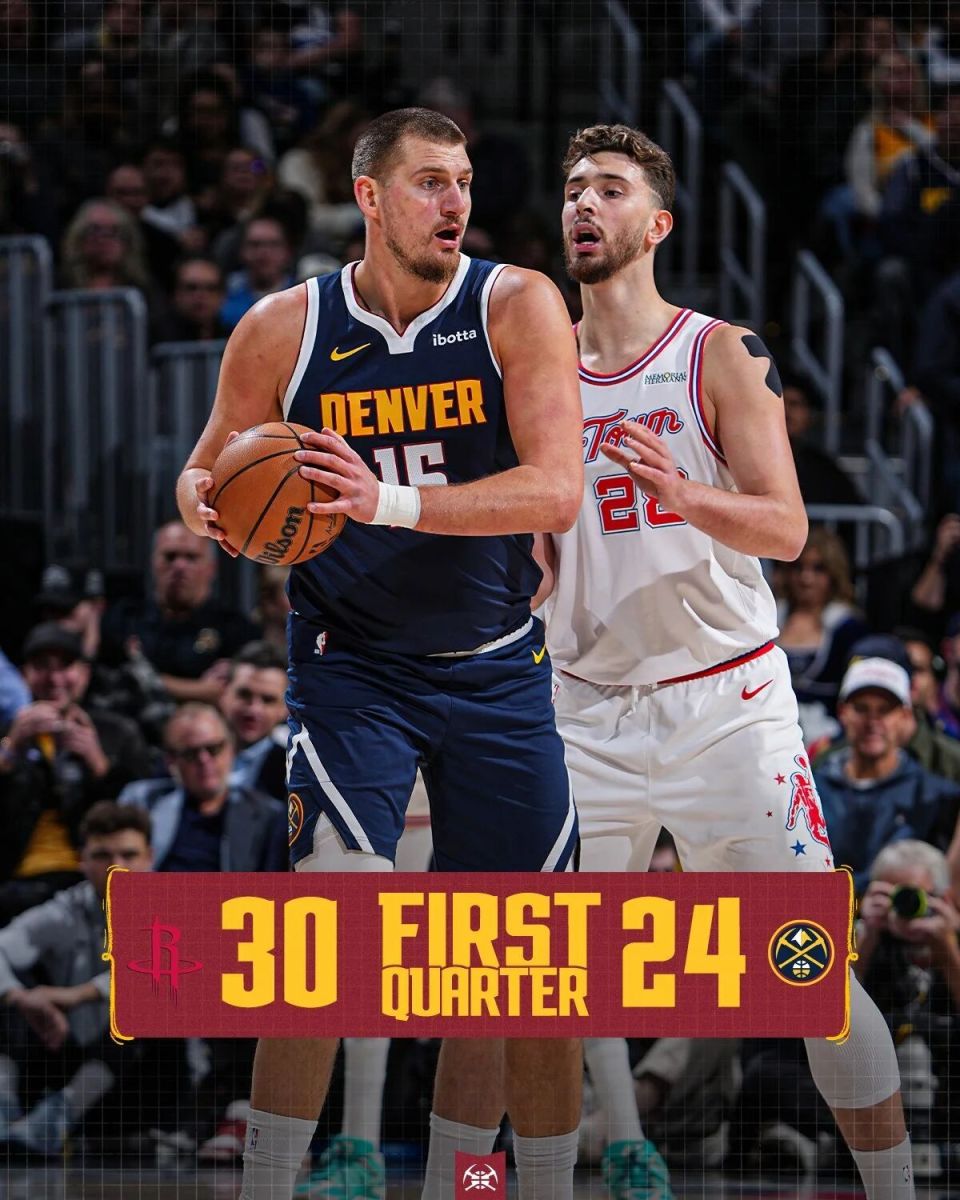 申京爆发,首节6中5砍下10分2篮板3助攻,杜兰特单节10分3篮板。上一次两队交手,当约老师防守时,申京只有6中1,今天小火龙变成喷火龙。第二节两队替补上场,瓦兰单节3中3,掘金反超。第二节后半段,火箭祭出死亡五大。