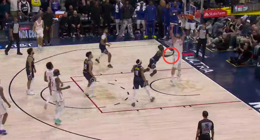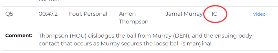 第二次是漏判,发生在距离比赛结束还有1分8秒,申京拼抢篮板时,突然摔倒在地,裁判没有任何回应。裁判报告指出,这一个回合是小哈达威伸手推在申京的身上,这次身体接触干扰了申京的篮板拼抢。这是一次漏吹的抢篮板犯规,同样是掘金获利,火箭吃亏。
