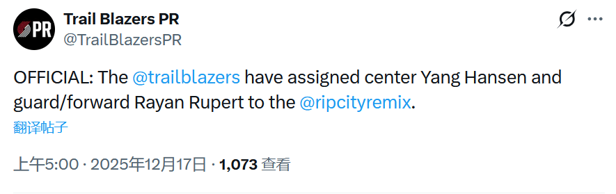 北京时间12月17日,开拓者队官方宣布,球队将再次下放杨瀚森,他将背靠背出战与国王队的G联赛!在昨天比赛中,杨瀚森打出上佳表现,并获得了来自混音队主帅的赞美。
