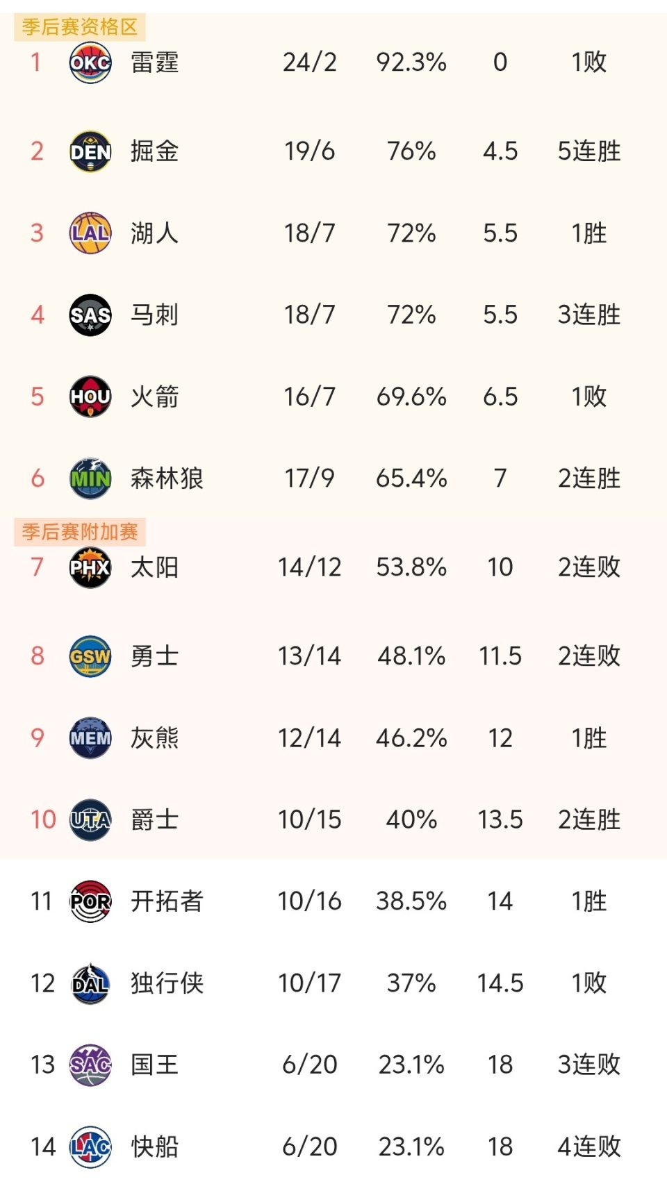 随着火箭加时125-128惜败掘金、快船4连败,NBA最新积分榜出炉!