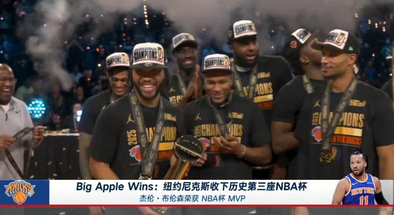 尼克斯夺冠颁奖仪式:唐斯布伦森高举奖杯大笑狂欢 布伦森荣获MVP