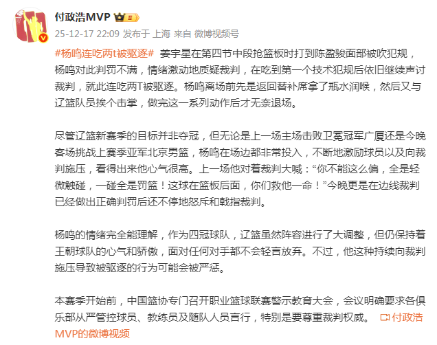 媒体人付政浩发文表示,连续抱怨裁判被驱逐可能导致杨鸣被严惩,因为中国篮协本赛季开始前明确要求各俱乐部严控球队言行,特别是尊重裁判权威。